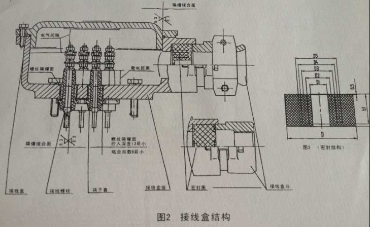 B、隔爆接合面的長(zhǎng)度間隙、表面粗糙度、結(jié)線盒內(nèi)部裸露導(dǎo)體之間、裸露導(dǎo)體與金屬外殼之間的電氣間隙及爬電距離見(jiàn)下圖1,2。