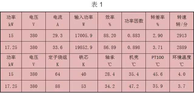從表中數(shù)據(jù)可以看出,定子繞組溫升、軸承溫度、機(jī)殼溫度都有明顯的升高。有的電機(jī)廠家做型式試驗(yàn)時(shí)只按照標(biāo)準(zhǔn)電機(jī)進(jìn)行試驗(yàn),不能準(zhǔn)確判斷電機(jī)在其他服務(wù)系數(shù)狀況下的性能指標(biāo)。