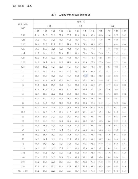 (2)提高了對三相異步電動機能效限定值要求(見表1,GB18613-2012的表1和GB 25958—2010的表1);