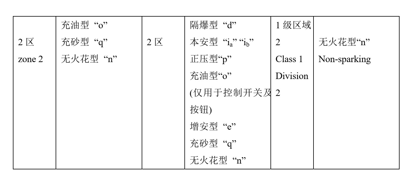 注:1于0區(qū)的防爆設(shè)備可用于1區(qū)和2區(qū);用于1區(qū)的設(shè)備可用于2區(qū);