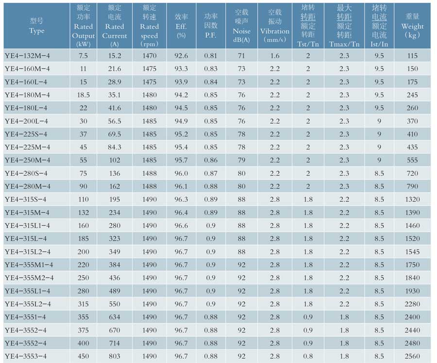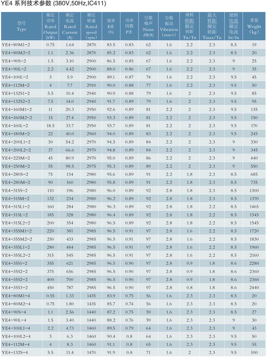 YE4系列電機部分技術參數(shù)